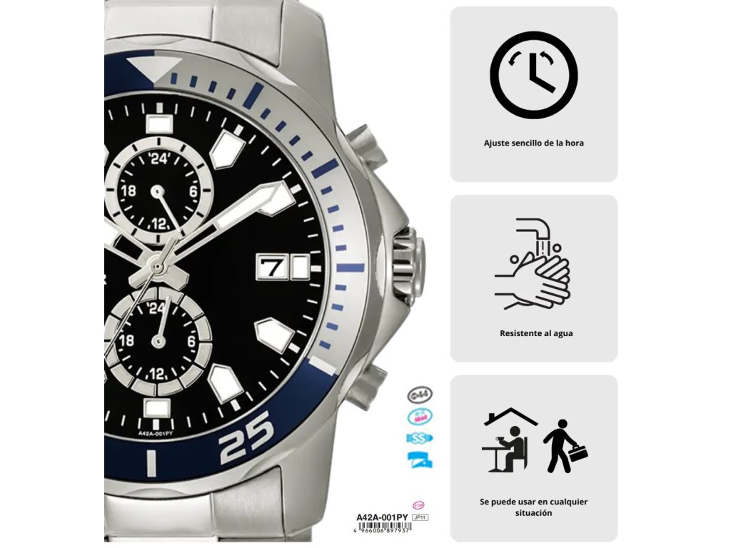 Tyto pánské hodinky jsou kombinací kovového pouzdra s ocelovým náramkem. Výztuha z tvrdého minerálního skla, odolného proti poškrábání. Displej je multifunkční v krásné černé barvě s jednoduchým designem, luminiscenčním povlakem a stříbrnými prvky. K dispozici jsou datumovky ve 3 hodinách, 12/24hodinový formát a duální čas.