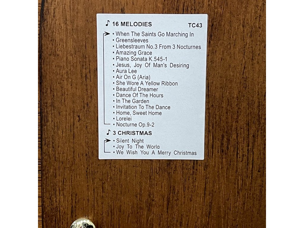 Přehrává jednu z 19 melodií každou hodinu ze 2 různých výběrů melodií nebo hodinové / čtvrthodinové zvonkohry Westminster.